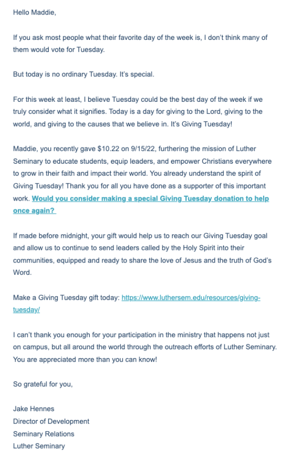 For Luther Seminary’s Giving Tuesday campaign, we wanted to test how calling out the user’s previous giving history would affect the conversion rate. To do this, we split their file into four segments: never donors, lapsed donors, lybunt donors, and active donors. After those were segmented, we split traffic 50/50 where the control segment saw language around “someone who supports the mission of Luther Seminary” and the treatment segment saw language that specifically called out their last gift DATE and last gift AMOUNT. (Or for never donors, specifically calling out that they had never given a gift to Luther Seminary before.)