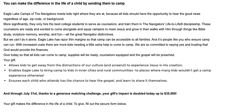 We then transitioned to the body copy and wondered if the value proposition message would resonate more strongly with potential donors if it was presented in the first person. We felt particularly confident in this assessment given the notoriety of ACI’s Founder.