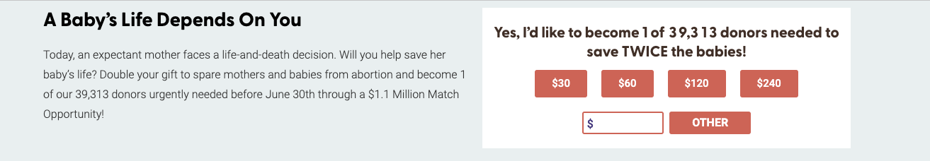The more effective treatment, however, was the daily donor goal. While this treatment also increased the visibility of the need and adds the social proof aspect, it also reframes the goal to be more tangible and achievable to the donor. A potential donor may feel that their donation is a drop in the bucket of a 39,000 donor goal. But being of 675 donors needed today may feel more accessible and attainable.