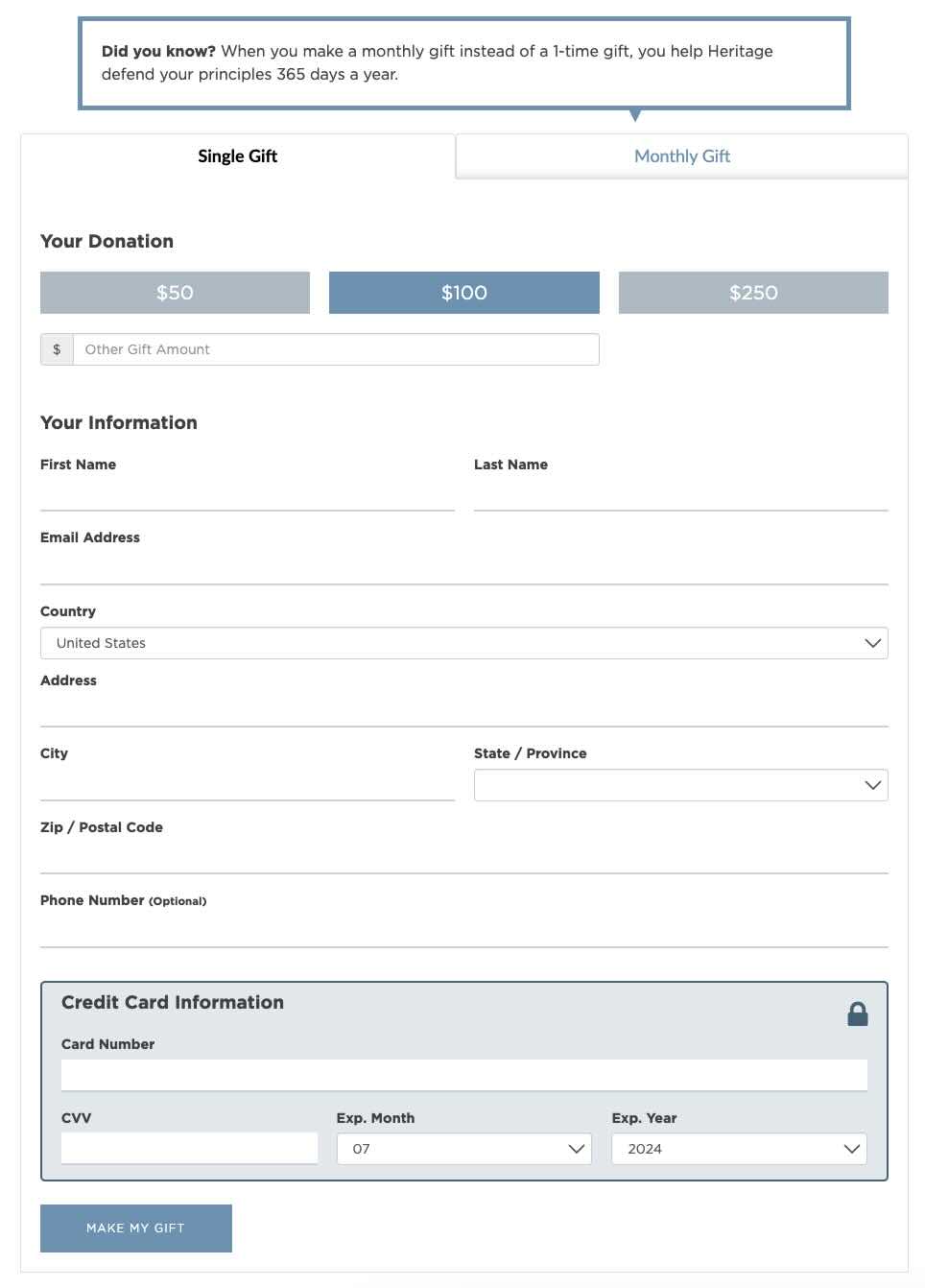 The Heritage Foundation had previously run a test on their membership renewal page where they added a small flag image to a tabbed donation form’s monthly gift tab in order to appeal to the patriotism of their donors, which led to an increase in donations.