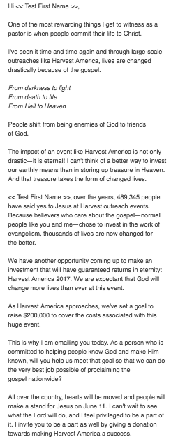 Harvest Ministries ran a high-urgency fundraising campaign leading up to a large-scale evangelism event, Harvest America. They sent a series of emails for the campaign to acquire donations and revenue. One of the emails they sent had a strong message about the eternal impact Harvest America has. In an effort to increase clicks to the donation page from the email, they tested putting a person’s testimony in the email copy. They split their file and sent the control without the testimony and the treatment with it.