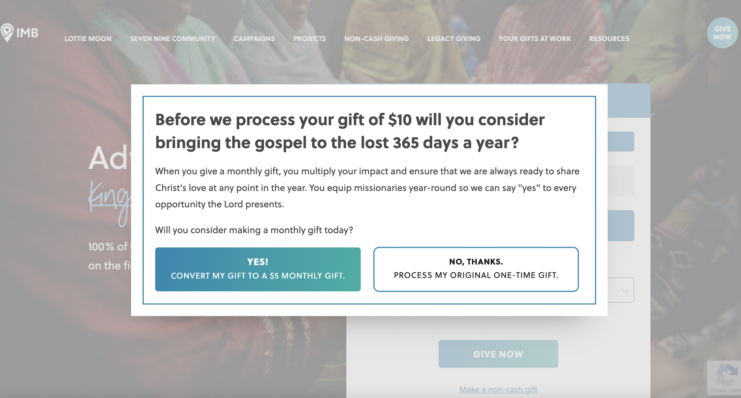 In an effort to increase the number of monthly donors, we wanted to prompt more people to give a monthly gift on the IMB’s main donation page. After the first step of the giving process (selecting one time + gift amount + selecting “Give Now”), they would receive a pop up that asked people to change their gift frequency to monthly. They would receive a custom ask amount based off of their original one-time gift amount. If their gift was over $200, they did not receive this prompt.