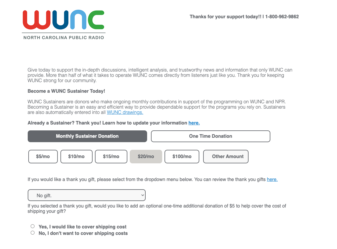 WUNC is one of North Carolina’s largest NPR stations. Most of their fundraising online comes through fund drives, which they have every other month.