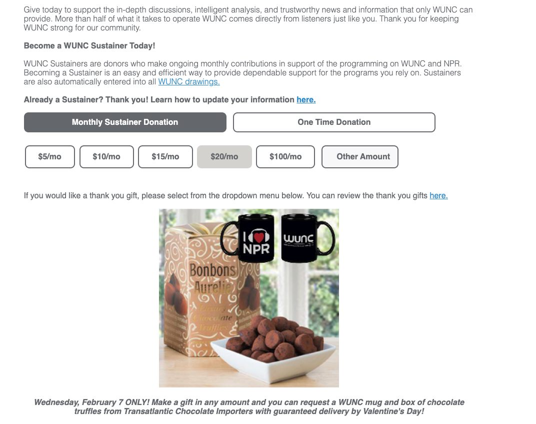 February’s fund drive features some great thank you gifts, which we’ve seen through past testing help motivate donors to give to support WUNC. On a specific day during this drive, WUNC offered a box of chocolates and a WUNC-branded mug as the thank you gift, delivered in time for Valentine’s Day. This was a one-day only offer, so we wanted to test whether adding an image of the gift on the donation page made a difference in conversion rates.