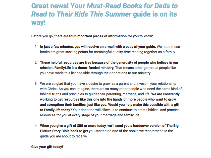 FamilyLife was running a name acquisition offer that included a summer reading list for dads. They wanted to test if adding an incentive to the donation form would increase donor conversion- in this case, one of the books mentioned in the offer. All other elements of the page remained the same.