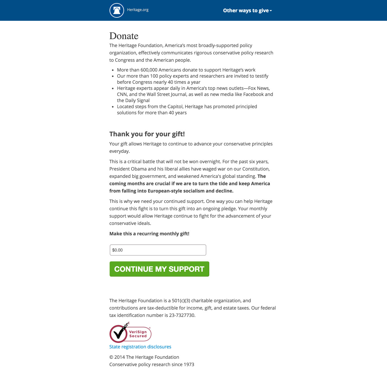 With the number of donors each month, the thank you page on the primary Heritage donation form offered an opportunity for testing. In an effort to further capitalize on the donor's motivation, we created two follow-on calls-to-action to either become a recurring monthly donor or to give a gift to their sister organization, Heritage Action.