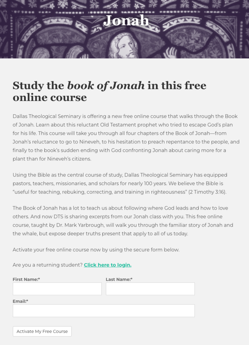 A new free online course was taught by the President of the Seminary. We had seen other organizations using evidentials in the form of testimonials to improve email acquisition results and we wanted to test this on the registration page to see if we could increase conversion by adding an element to enhance the visitor’s level of trust and perceived authority of the offer. We built a treatment that included a photo and quote from the online course instructor about what key learnings they would take away from the course by sharing what he personally has learned from studying the book.