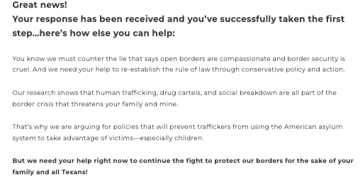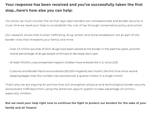TPPF’s Border Crisis Survey instant donation page is getting an instant conversion rate below 1%. In brainstorming ways to potentially increase conversion rate, we wondered if the addition of evidentials would further clarify and intensify the problem that the donor’s gift would help solve. For a test treatment, we added three bullet points towards the beginning of the value proposition copy, each one stating a research fact that speaks to the problems at the border.