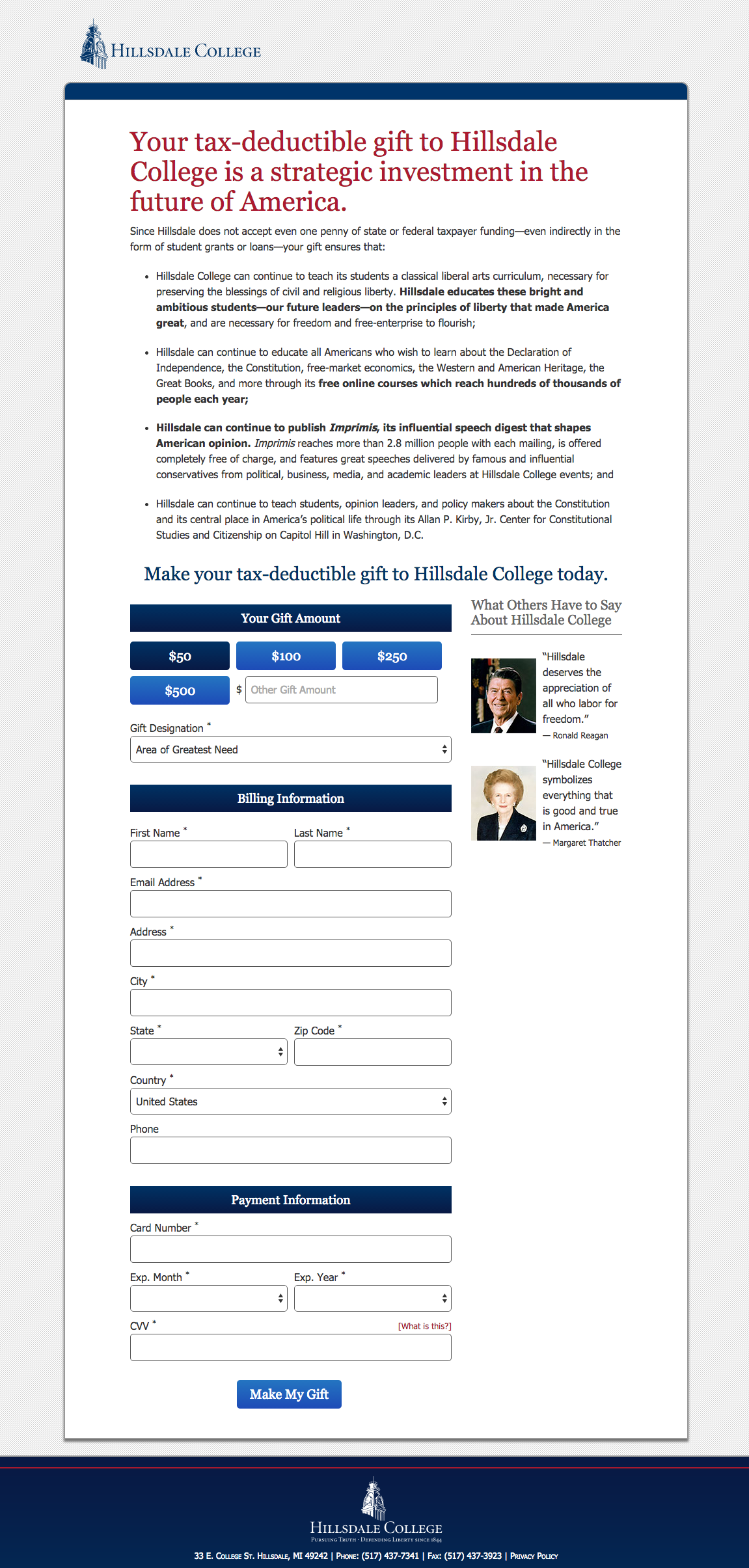 On Hillsdale College’s main donation form, we had done previous experiments to lift conversion rate 22% by modifying the format of the donation form and adding messaging around what we believed is both unique and appealing about Hillsdale College to potential donors. In an effort to continue optimizing this high traffic page, we shifted our focus to reducing friction and adding incentive to the gift.
