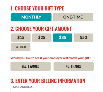 Save the Children runs multiple match campaigns throughout the year; for their fall match campaign, we wanted to test whether adding in ‘match math’ to a donation form would help increase conversions. Our hypothesis was that by showing the impact of a donor’ gift through ‘math’– Your gift of $25 becomes $50 in impact— we will help users recognize the increased impact of their gift, which will increase conversion. This experiment had 3 variants, with a control and 2 treatments that had the match math either above or below the gift array selections.