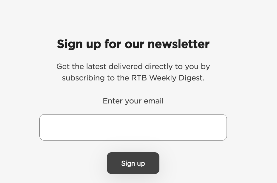RTB had run previous experiments on their homepage/website footer email subscription form that did not result in any valid lifts. There were some experiments that ran as a multivariate test that did not isolate a specific variable. In an effort to increase email acquisition rate through this newsletter sign up form, we decided to hone in on the value proposition in the copy. Our hypothesis was that by being clearer in what the recipient was receiving, we would see an increase in email acquisition rate. This is because the end user would understand what is valuable about RTB’s emails instead of just signing up for another email list.