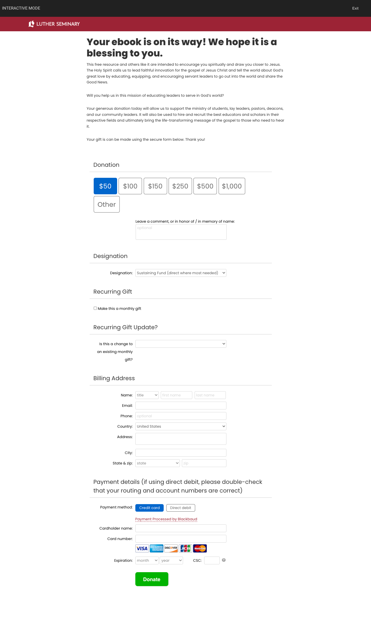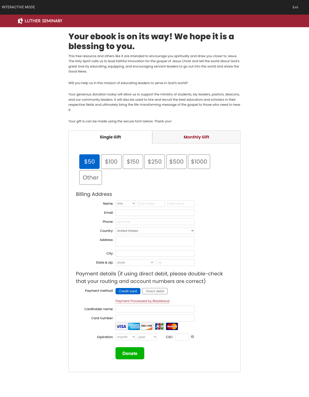 For Luther Seminary’s acquisition offer, Reconnect: The Way Forward, we wanted to test the tabbed donation form on their instant donation page in order to increase the donor conversion rate. For this experiment, we kept all steps of the funnel identical in each test with the exception of changing the donation form to have a one-time donation tab and a monthly donation tab. In doing this, we removed the friction in the standard donation form that included asking the donor to check a box to make the gift recurring and asking if this donation was a change to the monthly gift they already provide.