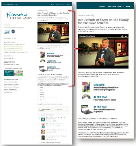 The Focus on the Family recurring gift donation page had copy on it that was very transaction focused. It had been that way for years. They hypothesized that they might be able to increase conversion if the copy was more value proposition focused rather than transactional. They developed a treatment that told the reader what their monthly gift would do and test this against their control.
