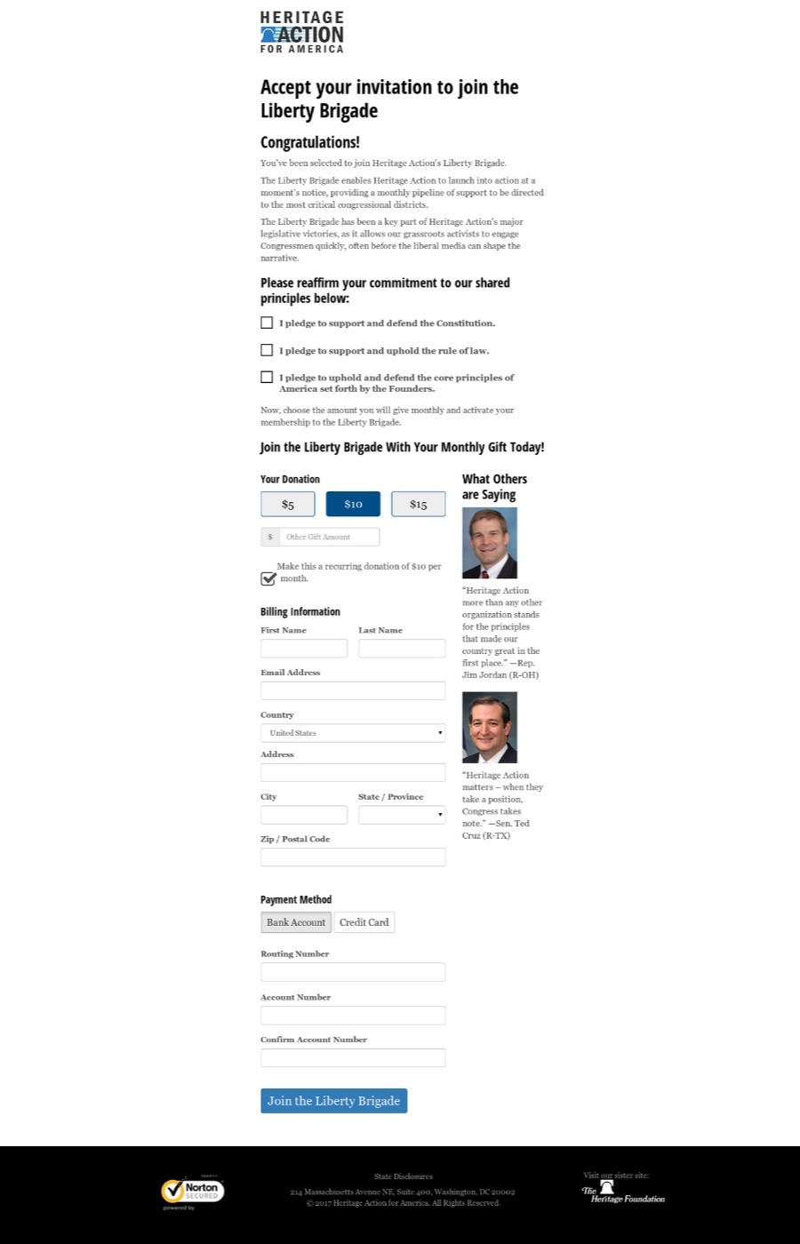 Heritage Action for America recently implemented an upgrade to their donation form. Historically, the online donation forms had only been able to capture credit cards. A recent upgrade provided the ability to also capture ACH transactions (donors could still make credit card gifts if they preferred).
