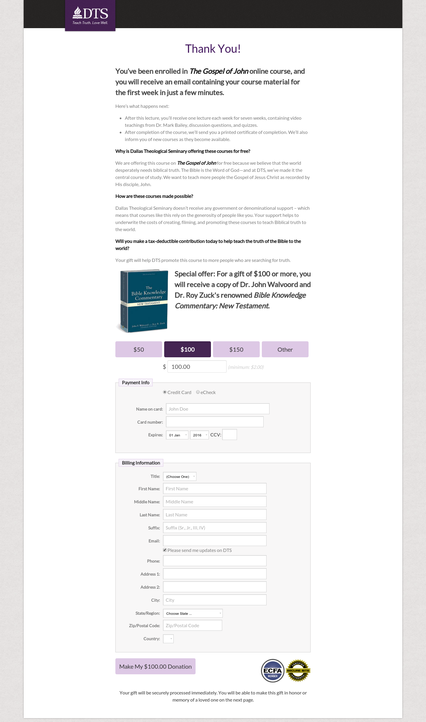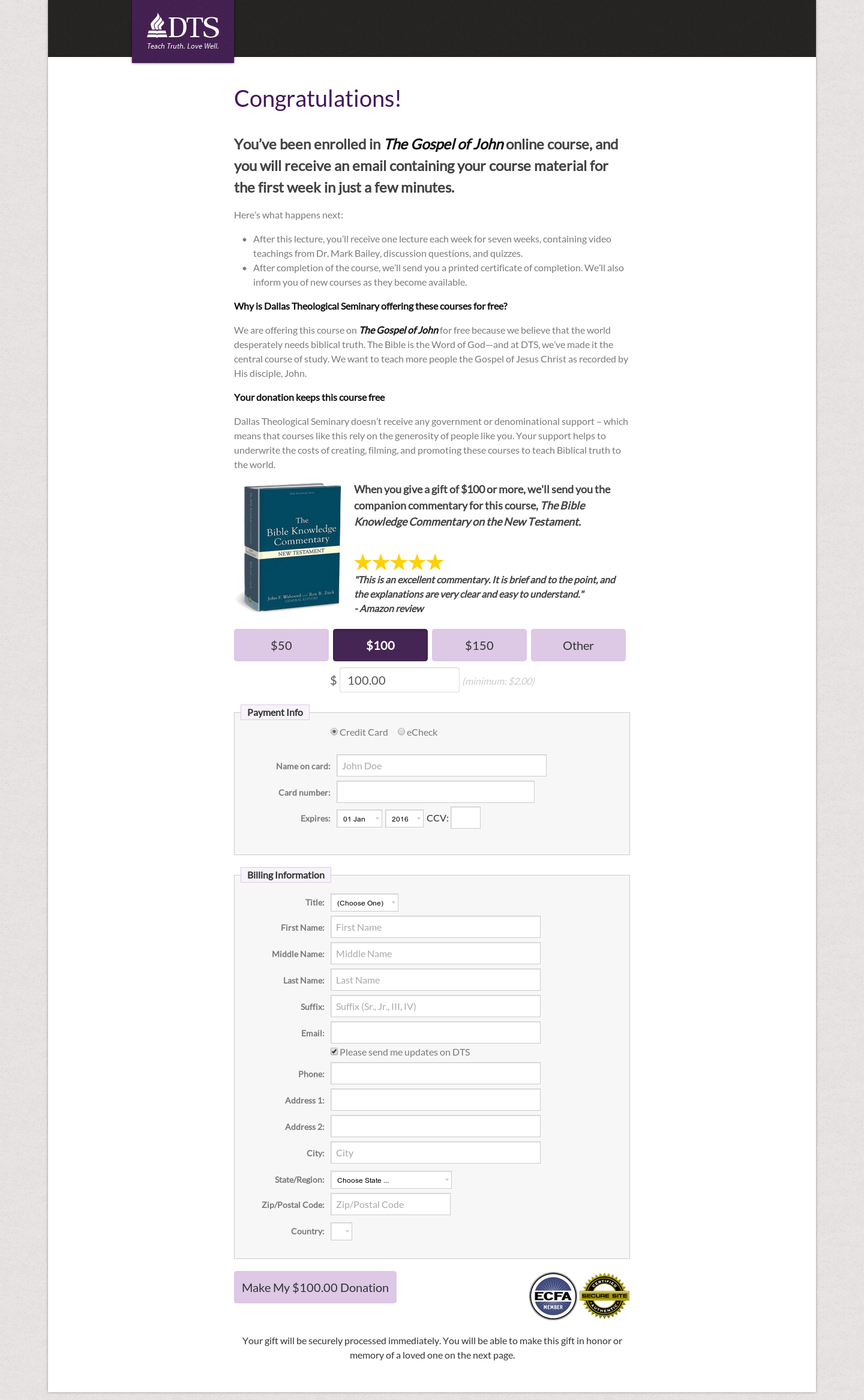 Dallas Theological Seminary had found a popular offer in their free Gospel of John course. After the user signed up, they were given the opportunity to make a gift.In exchange for a gift of $100 or more they were offered a commentary as the course companion book for the Gospel of John course. DTS decided to try to see if they could increase conversion rate by integrating review content for the commentary into the donation page. They pulled some reviews from a popular book review site onto the page, showed five stars, and gave a positive review for the commentary, hoping that this would increase conversion.