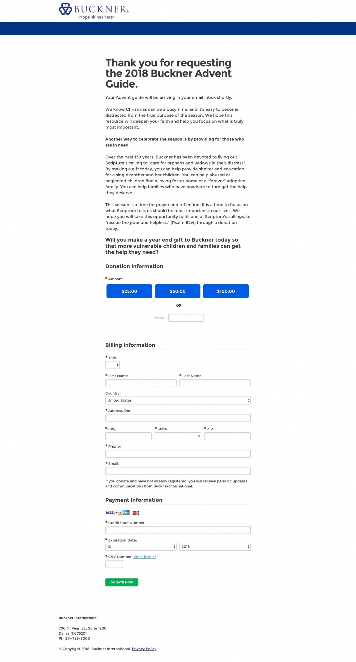 For the instant donor conversion page on Buckner’s Advent Devotional, we wanted to test out a theory in conversion optimization known as Construal Level Theory. The theory states that an individual would be more likely to take an action that went against their own personal self interests if they felt it benefited a small group that they were a part of. In this situation, we were asking them to give a donation because they were part of a select group of people that wanted to protect vulnerable children this Christmas season.