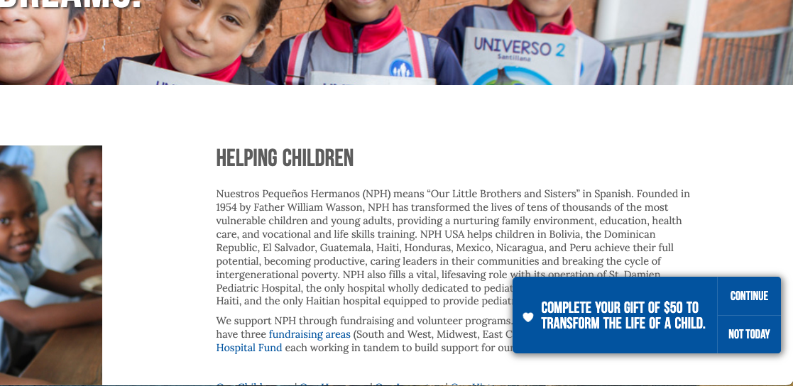 To increase conversion on NPH’s main donation page, we hypothesized that an abandoned cart pop-up would help recapture donors who had arrived on the main donate, started making a gift, but abandoned the process for one reason or another. If the user navigated to a different portion of the site, or simply X’d out and returned at a later time, they would receive a prompt that asked them to finish making their donation. The pop-up was set to dynamically pull the gift amount the user had previously selected as well as the frequency, allowing them to resume where they had left off.