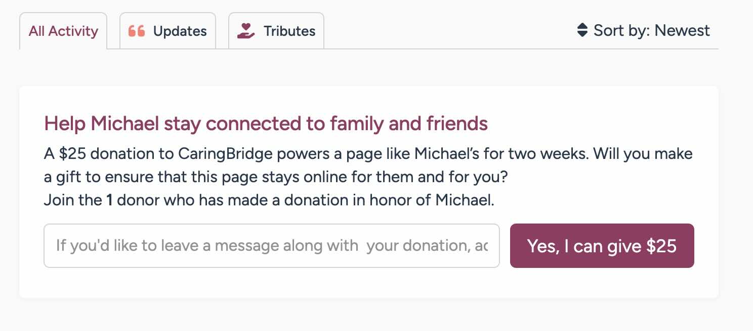 During CaringBridge’s 2-day match appeal, the Tribute widget copy would be updated to include mention of the match opportunity in addition to highlighting the usual $25 callout. In the control, the CTA button was “Donate to CaringBridge today.” We hypothesized that by turning this CTA into an affirmation of the question “Will you give $25?” would improve conversion rate.