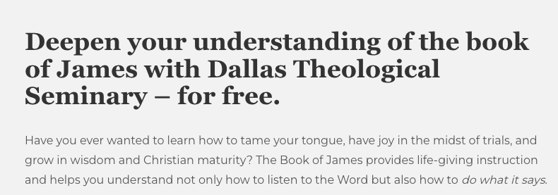 The Dallas Theological Seminary’s James course landing page is producing a 19.1% sign-up rate and $7.57 gross cost per name – both metrics are missing their benchmark. In an attempt to improve these results, we’ve developed a landing page test that tests what the user hopes to get out of the course.