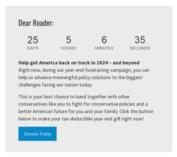 The Heritage Foundation regularly uses dear reader ads to promote direct appeals or acquisition offers on The Daily Signal news articles.