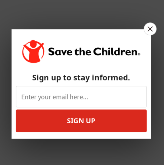 Save the Children uses a forced pop-up on their website to acquire email addresses. The copy and and trigger timing of the pop-up has been tested in the past with little to no impact on conversion, so we hypothesized that the placement of the feature may impact conversion. To test this, we developed a treatment that functioned more as a slide in feature on the bottom of the page than a forced pop-up. No copy or design of the feature was changed.
