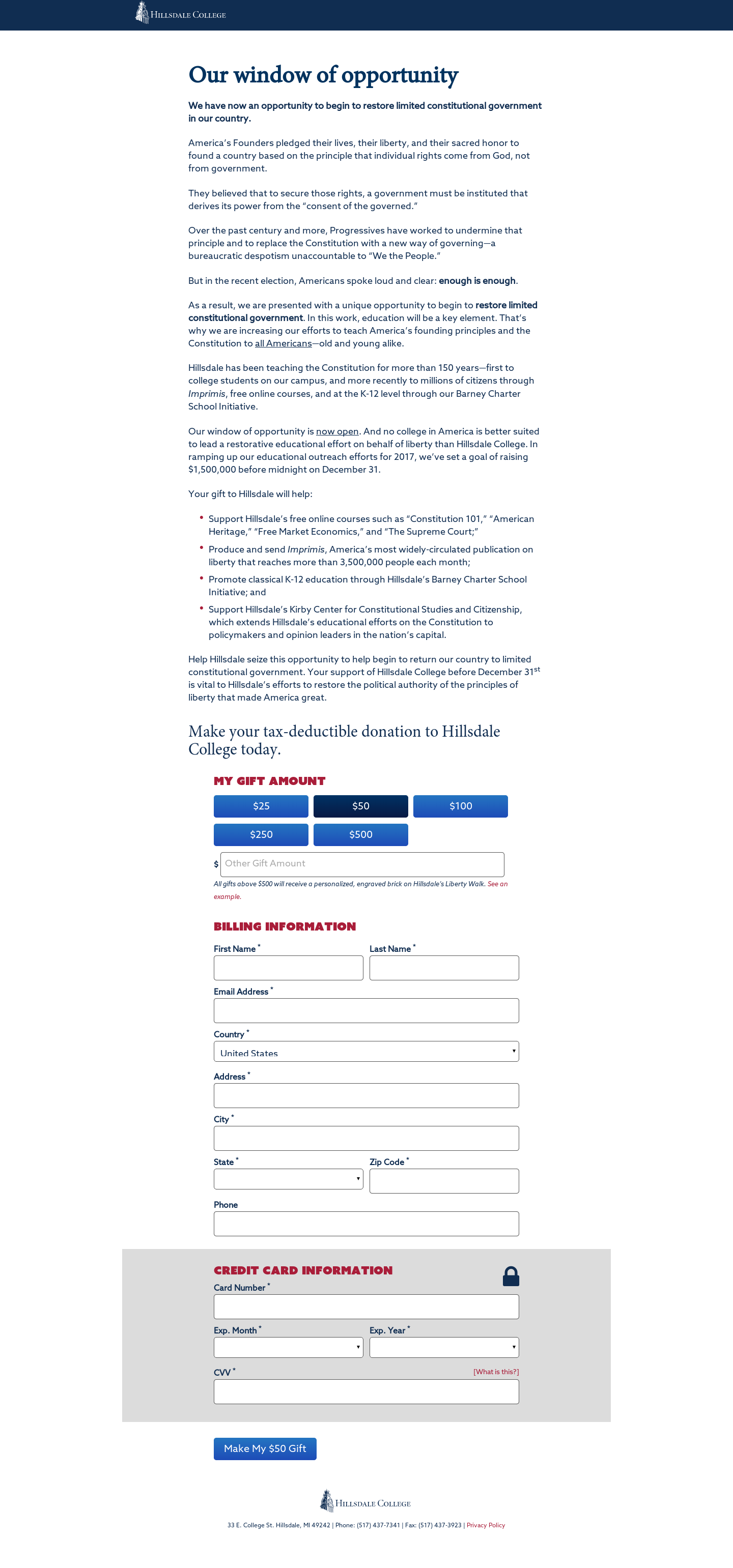 Hillsdale College started their calendar year-end campaign with the intent to launch a thermometer on their donation page once they achieved a critical mass of donations toward their goal. Previous testing had shown that the ideal time to introduce a thermometer to maximize conversion was when the goal was at least halfway met. However, the team wondered if putting the empty thermometer on the page would disincentivize visitors from giving.