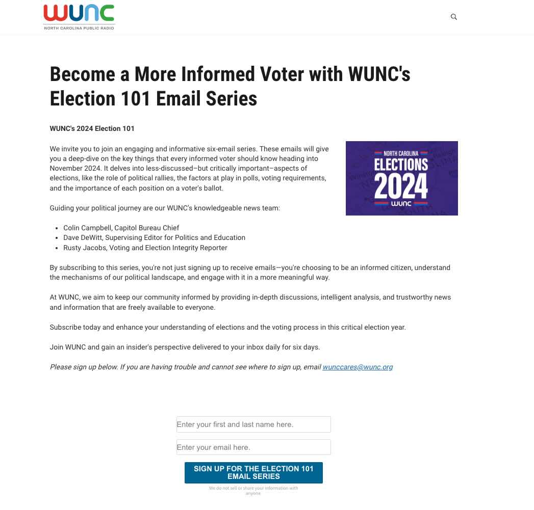 This experiment was conducted for WUNC, a North Carolina-based radio station, focusing on a content offer landing page designed to encourage prospects to sign up for an email series aimed at helping them become more informed as the 2024 elections approach in North Carolina. We aimed to test different headlines to determine whether a more instructional would lead to higher email acquisition rates. The control group featured only the title of the email series.