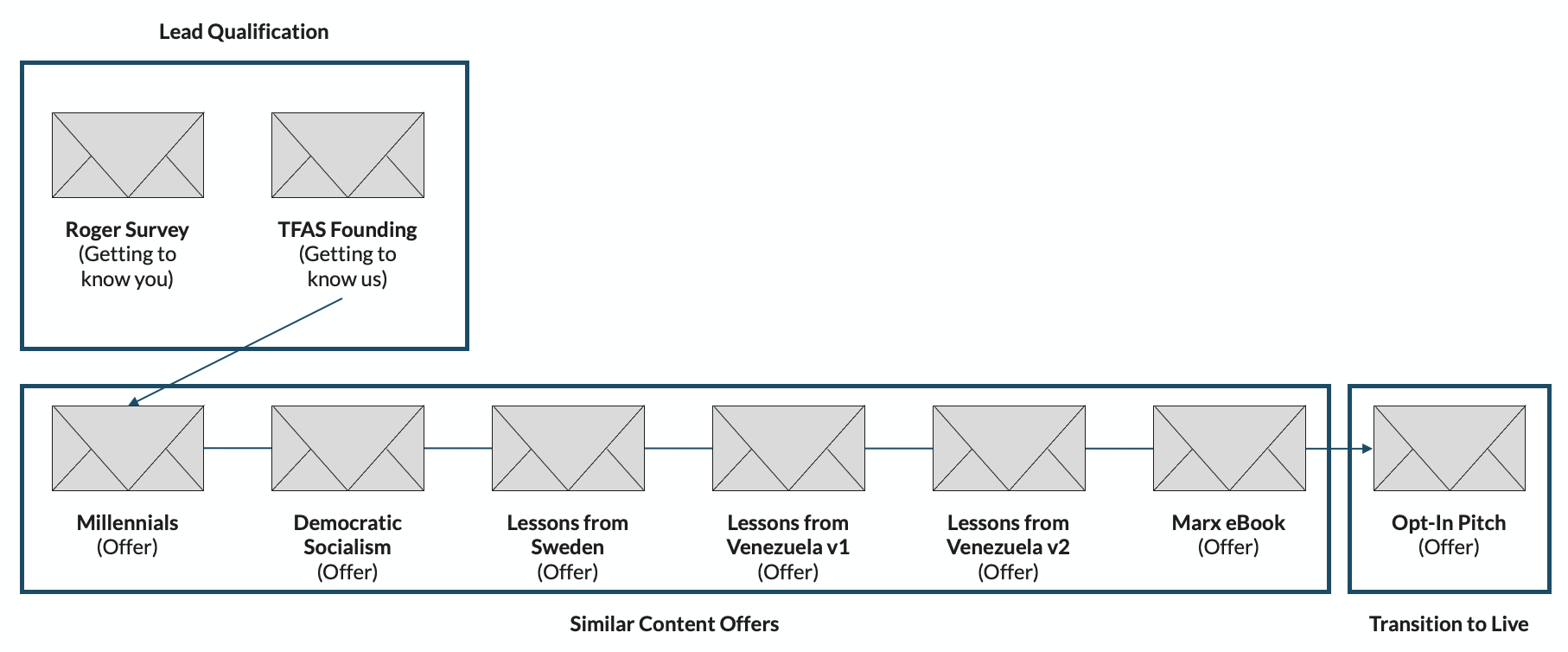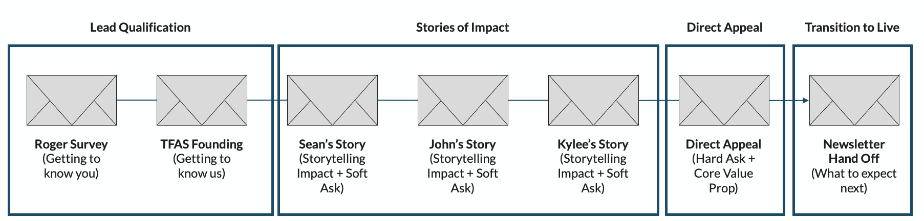 Initially, they did not have many content offers to provide to prospects, which forced them to initially launch with a welcome series that was focused on telling the story of the organization, or “proving the concept” of their impact by sharing story-based appeals that focused on high-profile alumni. This series also ended with a direct appeal, which was trying to get them to become a first-time donor.