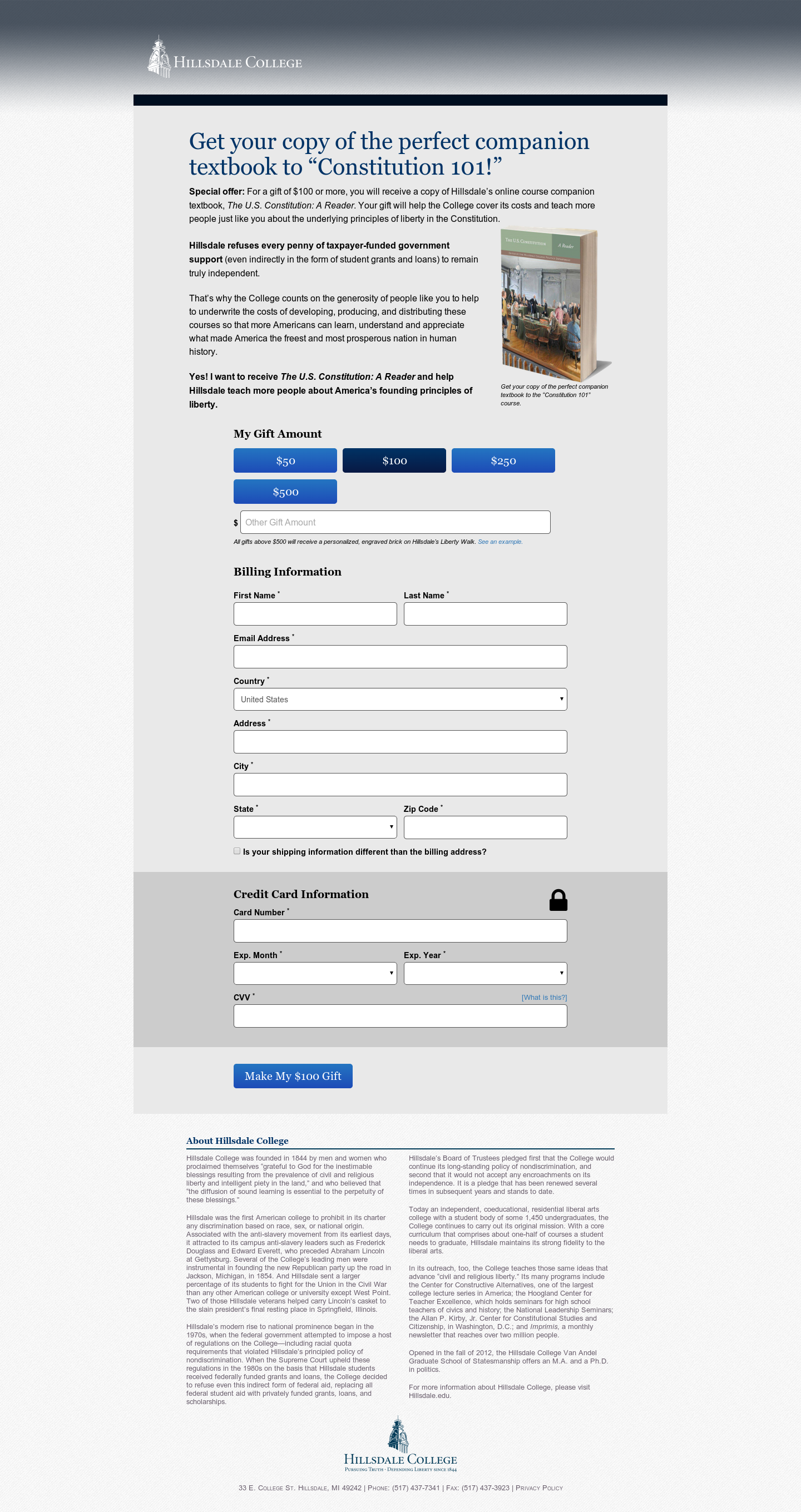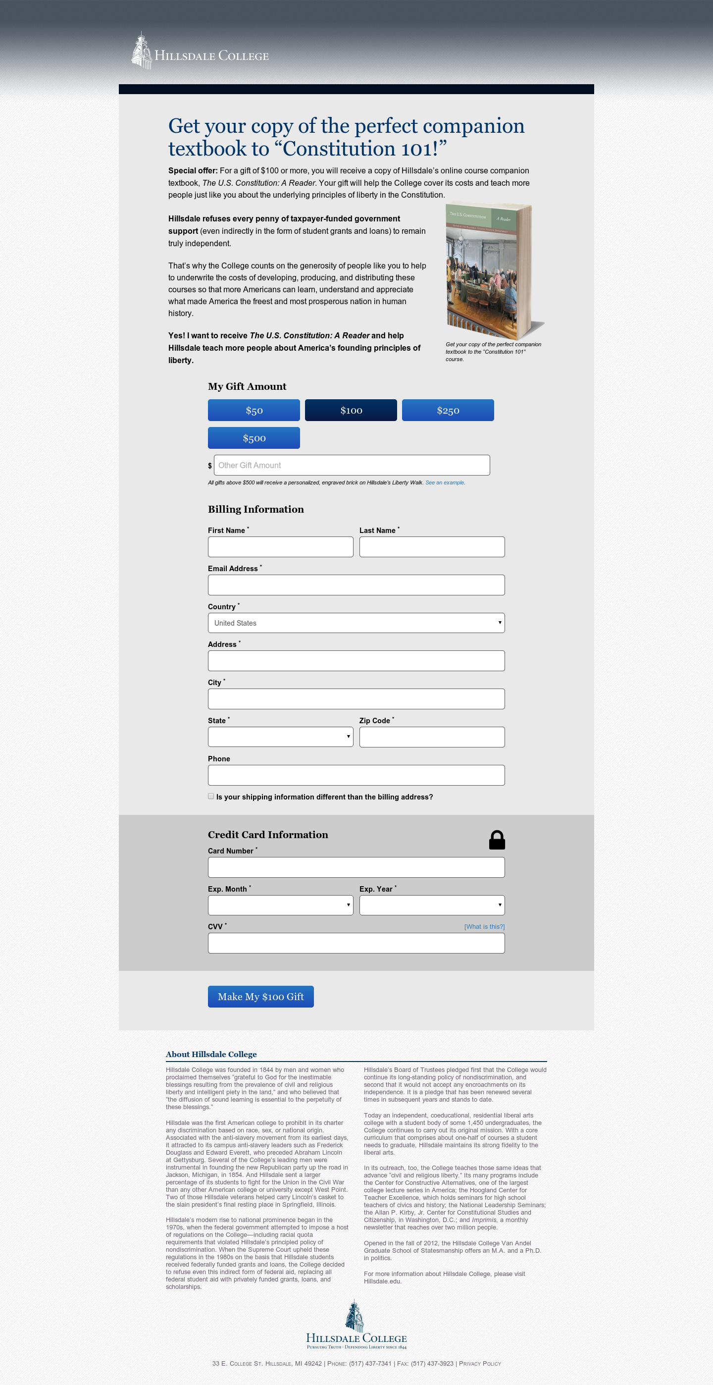 Hillsdale College was looking for ways to continue to improve their donation page. One of the factors that potentially hindered donor conversion is the friction associated with filling out the donation form. In an effort to reduce that friction, we decided to see if removing the phone number field would increase the likelihood of a visitor to make a gift. This field was already optional but the hypothesis was that by simply having this field as an option, it created mental friction in the mind of the visitor.