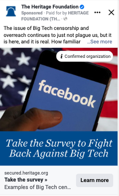The Heritage Foundation wanted to improve CTR on their Big Tech Survey campaign. The original ad had long, issue-focused copy and a statement on the ad image telling the audience to take their survey to fight back against big tech.
