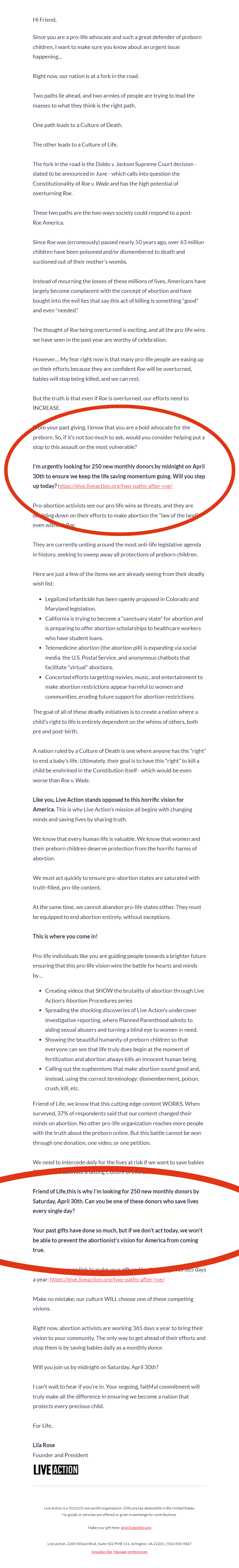 Live Action is a pro-life organization that uses online content and breaking-news stories to change hearts and minds on abortion and reveal abortion’s impact on everyone involved. During their 5-day Spring Monthly Donor High Urgency Campaign, Live Action wanted to see if they could increase donor conversion by asking each donor for a specific donation amount that was based on their prior giving history. Donors receiving this treatment would be thanked for their gift and told that instead of that amount, they could have an even greater impact by giving this new amount on an ongoing basis as monthly donors.