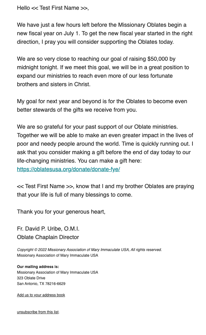 The Missionary Oblates of Mary Immaculate serve poor and needy people in the United States and more than 70 countries around the world. In June, they announced a rebranding, where they combined 3 of the organizations that operated under the Missionary Oblates umbrella into one- The Missionary Oblates of Mary Immaculate – USA. This rebranding also coincided with the end of their fiscal year, so as part of their fiscal-year end high urgency campaign, we focused on what the new organization would do (increased efficiencies in fundraising).