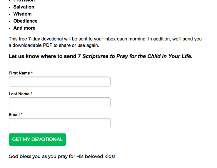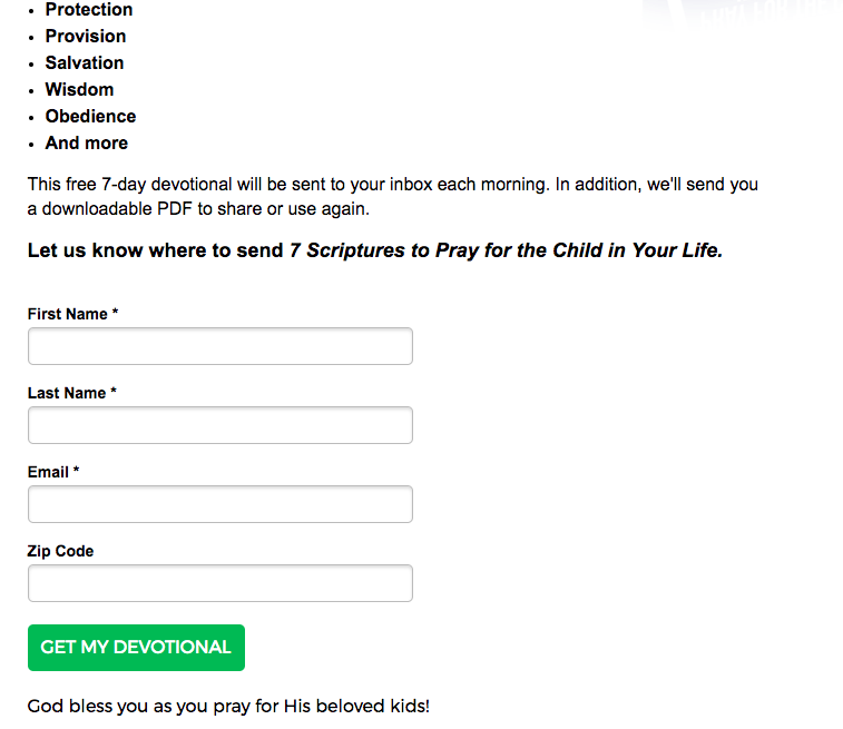 Buckner International wanted to retrieve zip code information from new people coming onto the email file via their content offer, 7 Scriptures to Pray for the Child in your Life. They wanted to see if adding a required zip code field would significantly decrease conversion rate.