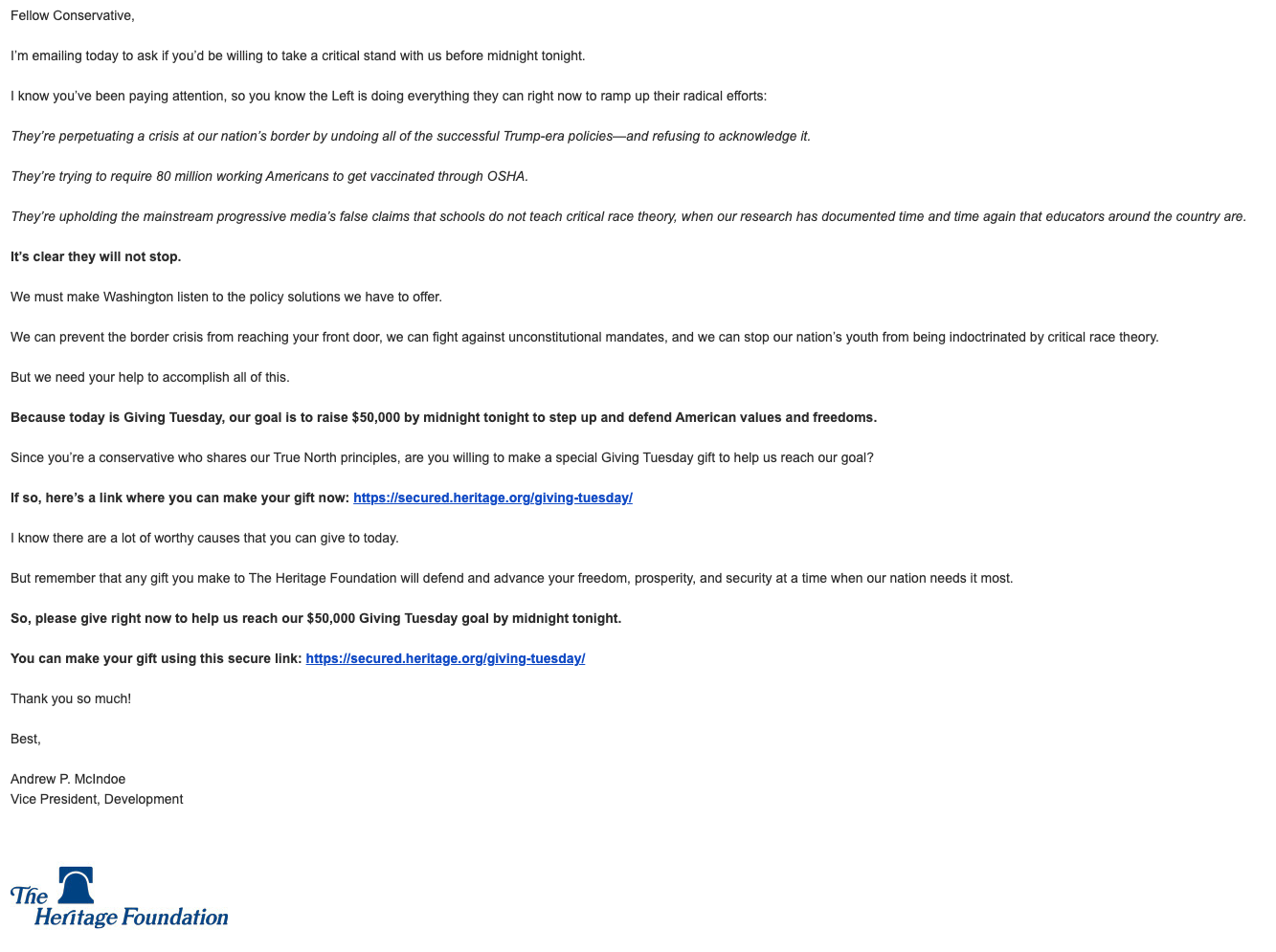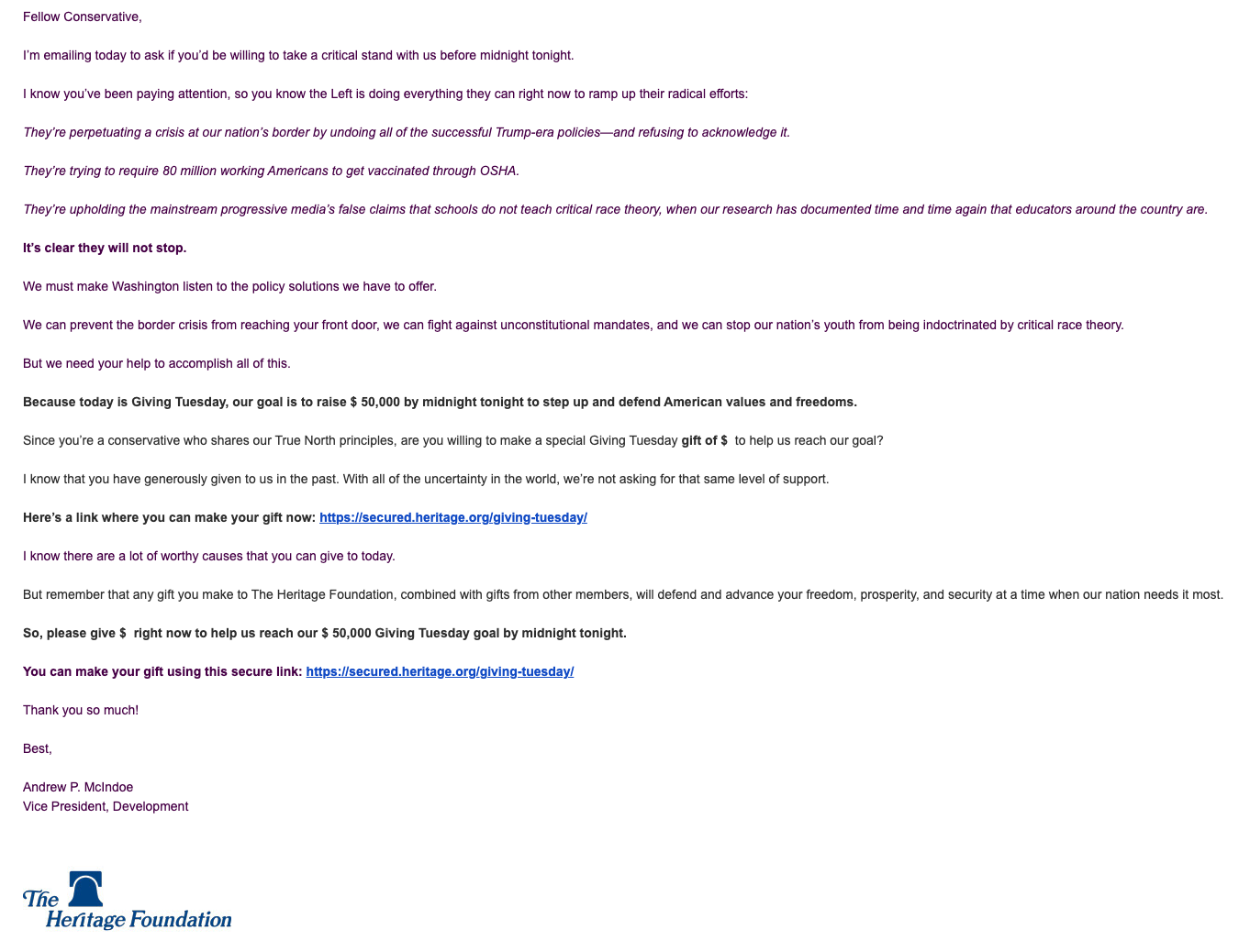 As part of their Giving Tuesday campaign, The Heritage Foundation wanted to test a relatively new concept known as the downgraded ask. For this experiment, they created a chart of standards based upon the donors’ previous highest contribution where they would ask for a certain number of donors to give a specific amount. For the treatment version of this ask, they asked for a level below what the donor had previously given and added language acknowledging that they were being asked for less.