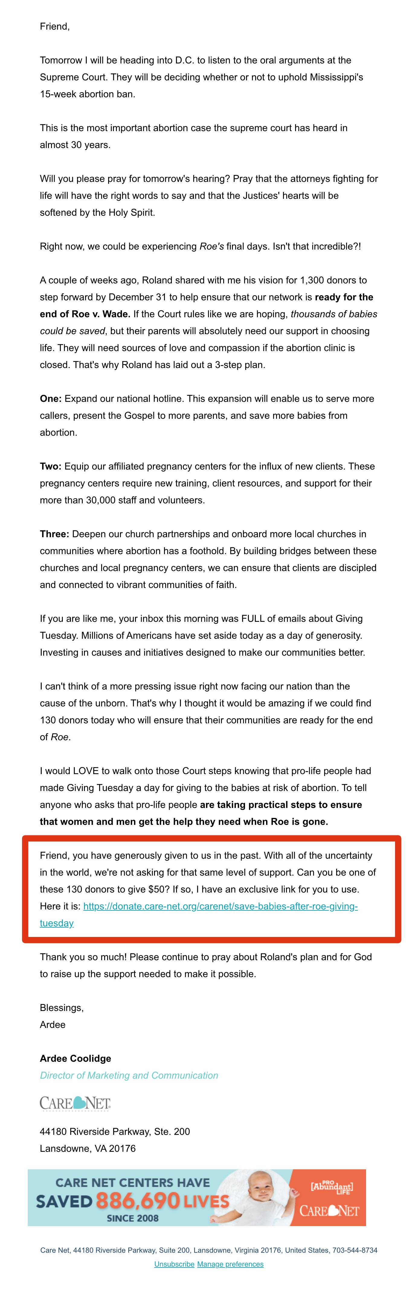 It would be worth iterating on this concept but to validate this concept with the Care Net donor file, we will need to expand the length of this test for several email during a high urgency campaign.