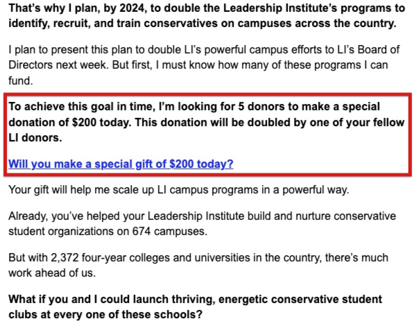 As a part of a February matching gift campaign, the Leadership Institute wanted to experiment with whether asking a donor for less than their highest gift would impact overall donor conversion rate and revenue.