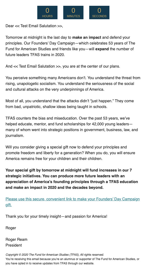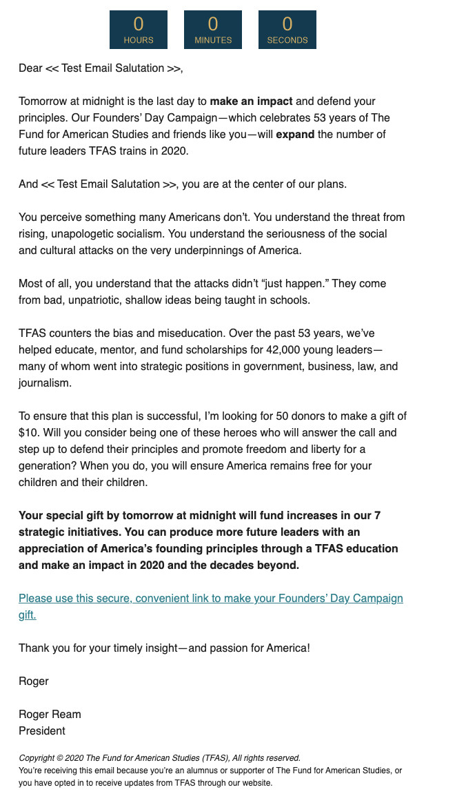 During the Founders’ Day Campaign for The Fund for American Studies, we wanted to test whether presenting a smaller ask (or “micro ask”) instead of a larger, nebulous amount (of their “most generous gift” amount) and what affect it would have on donor conversion rate or revenue collected in the context of this campaign.