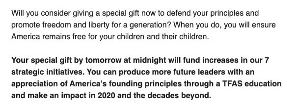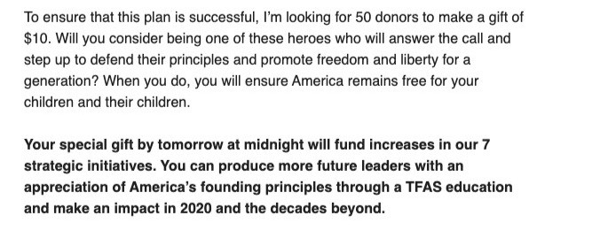 During the Founders’ Day Campaign for The Fund for American Studies, we wanted to test whether presenting a smaller ask (or “micro ask”) instead of a larger, nebulous amount (of their “most generous gift” amount) and what affect it would have on donor conversion rate or revenue collected in the context of this campaign.