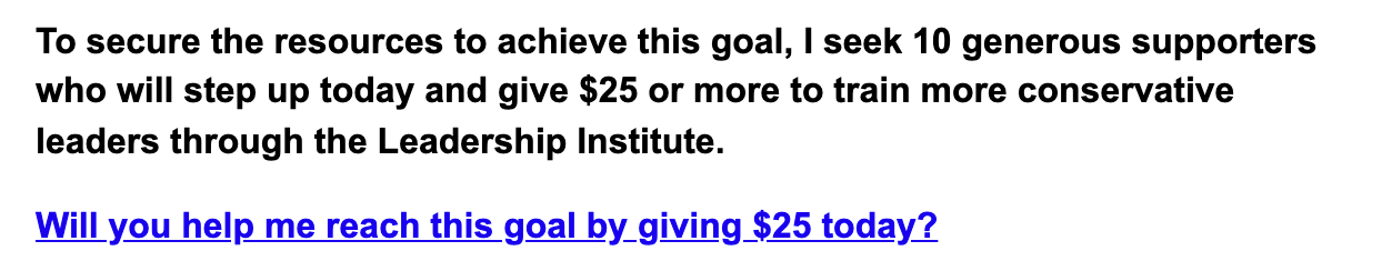 During the Leadership Institute’s “2021 Year-End” campaign, we wanted to experiment with asking donors to be one of a few donors to give a specific gift amount to see if it would increase the donor’s likelihood to give, or their generosity altogether.