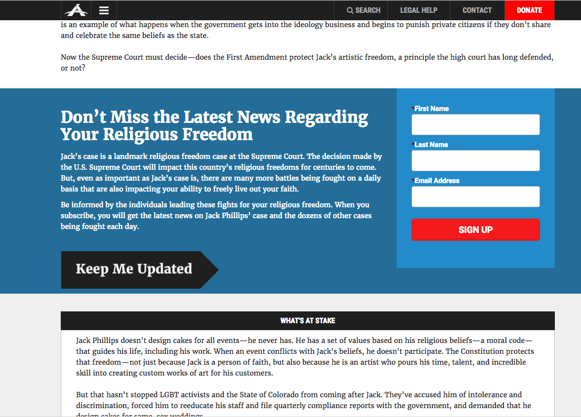 Alliance Defending Freedom recently conducted a test with their exit intent offer, asking: Will a more case-specific offer increase email acquisition? The results of that test were inconclusive but prompted a similar test on their ‘Jack Phillips’ information and email acquisition page. They asked: Will a case-specific newsletter offer increase email acquisition? They created two versions and launched an A/B test to find out.