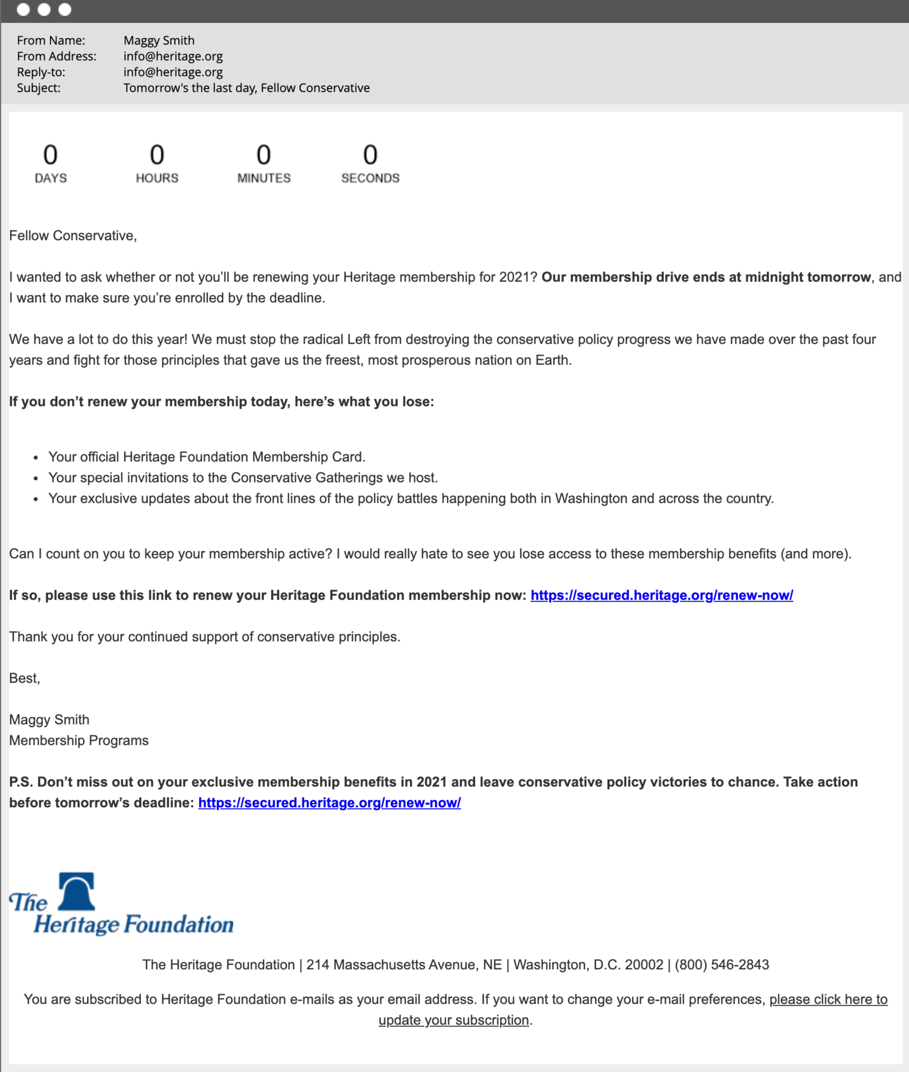 For an annual membership campaign, we wanted to look at ways to optimize the email envelope for The Heritage Foundation appeals. We tested the open rate for emails from two different senders. The control email included Maggy Smith – a representative from Membership Programs – as the sender, and the treatment email included Kay C. James – President of The Heritage Foundation – as the sender. The subject line and body copy was the same for each email.
