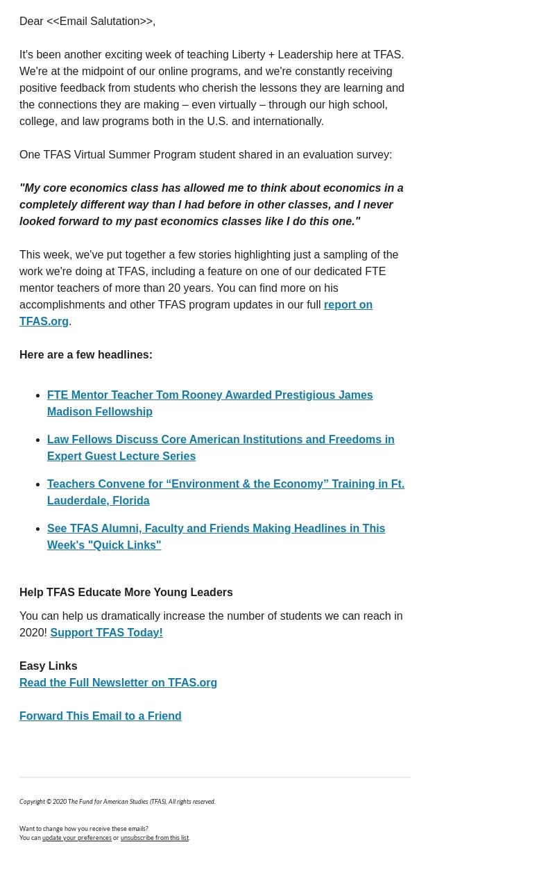 As a part of optimizing their program, TFAS wondered if switching who sent their weekly newsletter email to subscribers could improve their email engagement rates. To test this experiment, we decided to send three straight weekly newsletters and combine the results so as to mitigate false readings from a single email send.