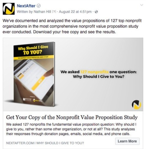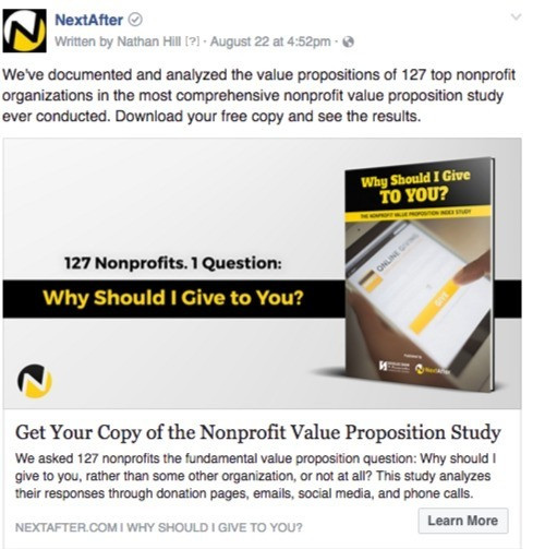 When promoting the Why Should I Give to You? research study on nonprofit value proposition, we came to the realization that our Facebook ads were a little bit hard to read. The yellow text against the light gray background seemed to get lost when scrolling through a Facebook feed.