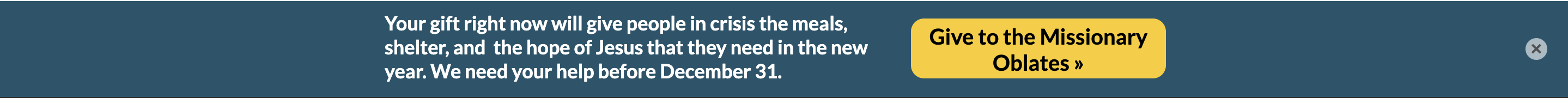 During their calendar year end campaign, the Missionary Oblates were running a sticky bar on their website promoting giving during year end. This sticky bar was placed across their website. Due to some other successes in talking to their constituents like partners in their mission, we wanted to test similar language on the year end sticky bar. So we tested the typical year-end language with elements of urgency against a more communal language with a more conversational tone that also pointed to the upcoming deadline to give.