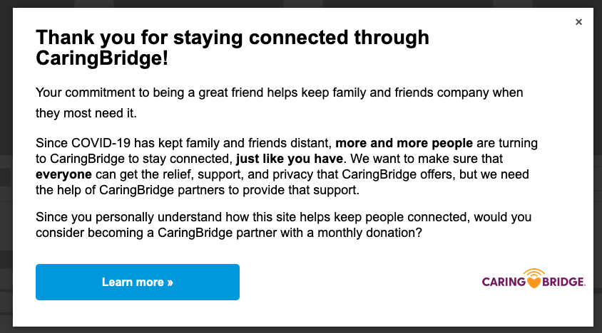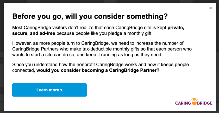 CaringBridge had run a popup asking visitors on their 2nd and 8th visits to become a recurring donor for more than a year, which had built a strong base of monthly donors. The control asked donors to “consider something” before they go, and then talked about the need for recurring donors. They decided to try to include some “communal language”, that first thanked the donor for staying connected to the CaringBridge community and then