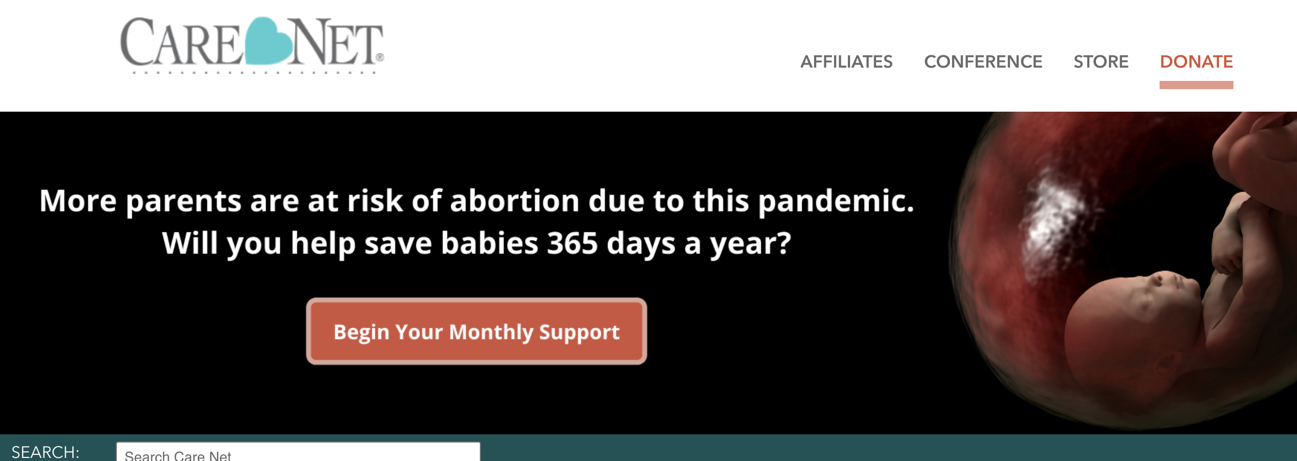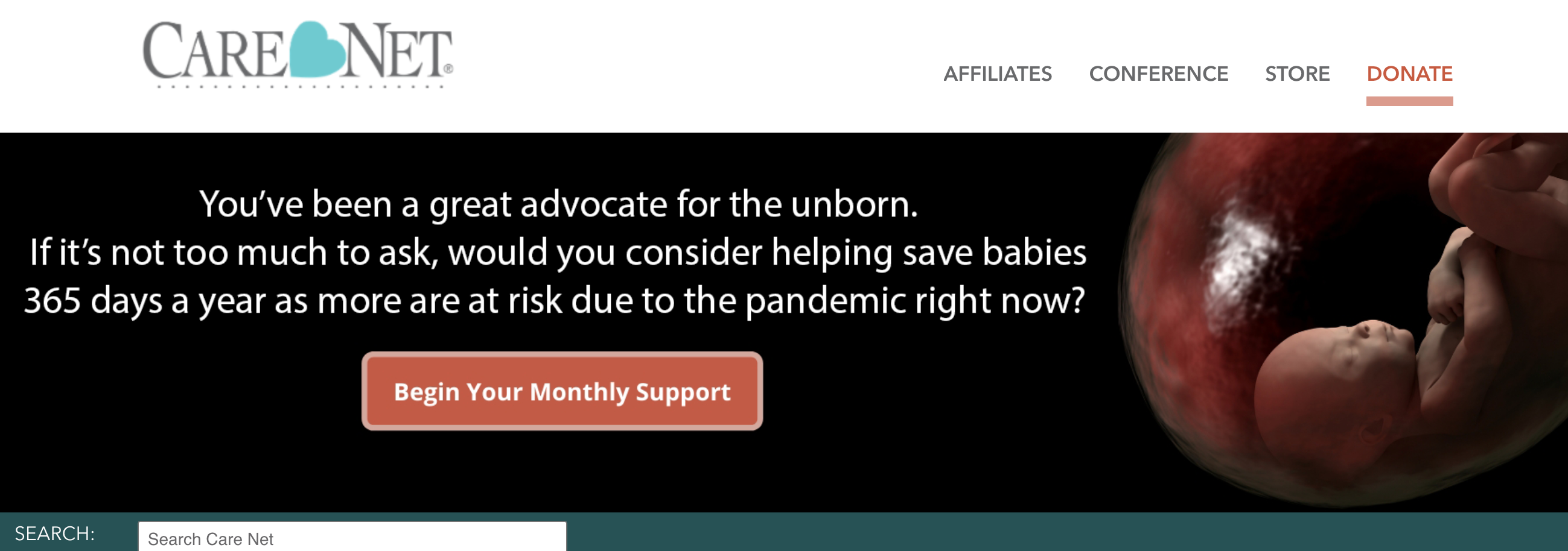 Care Net gets a healthy conversion rate on the hero image of their website. The call to action is to make a (monthly) gift, though they get a high volume of one time gifts from it as well. To see if we could increase the conversion from the banner, we wanted to test communal language on it.
