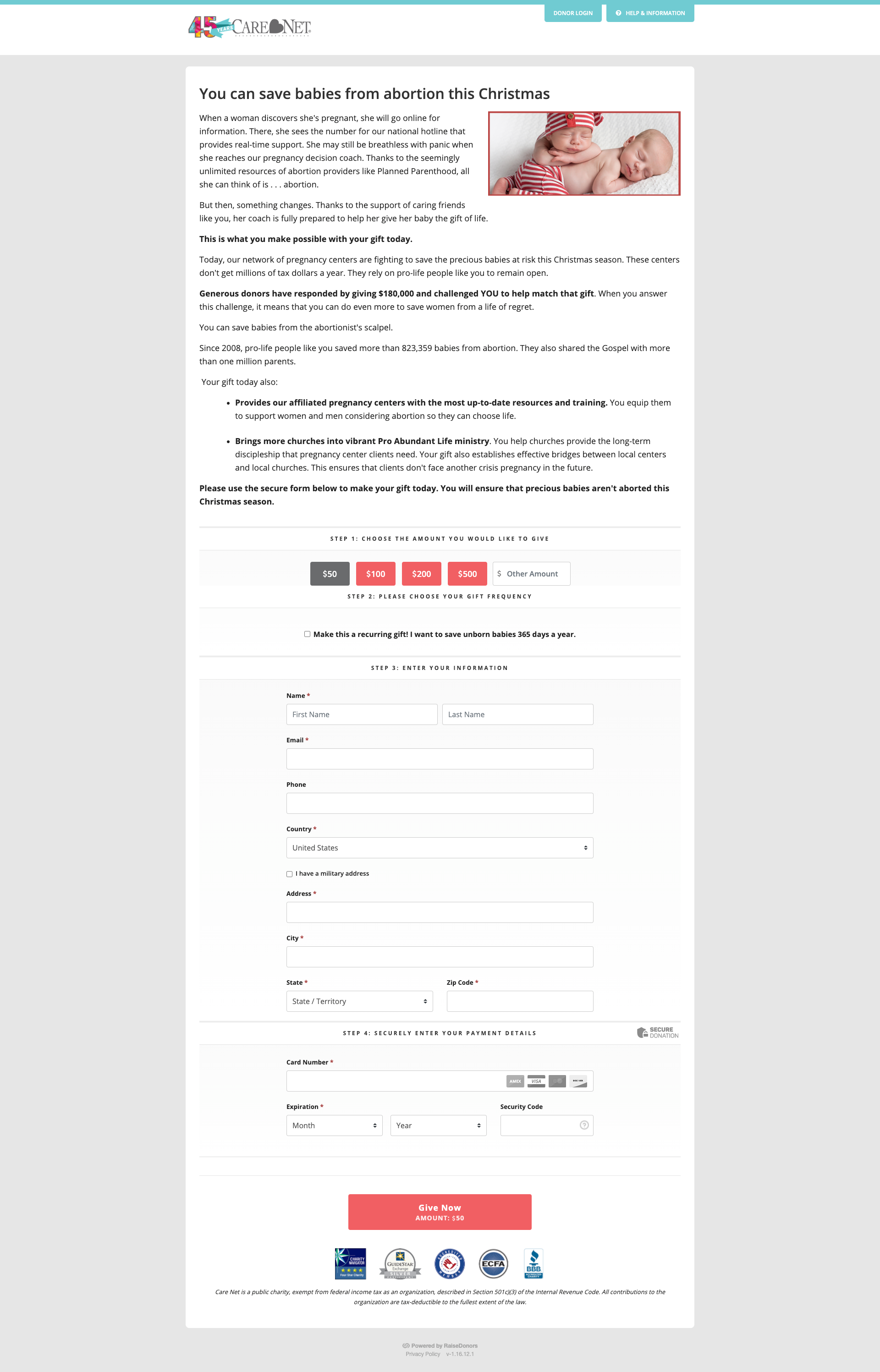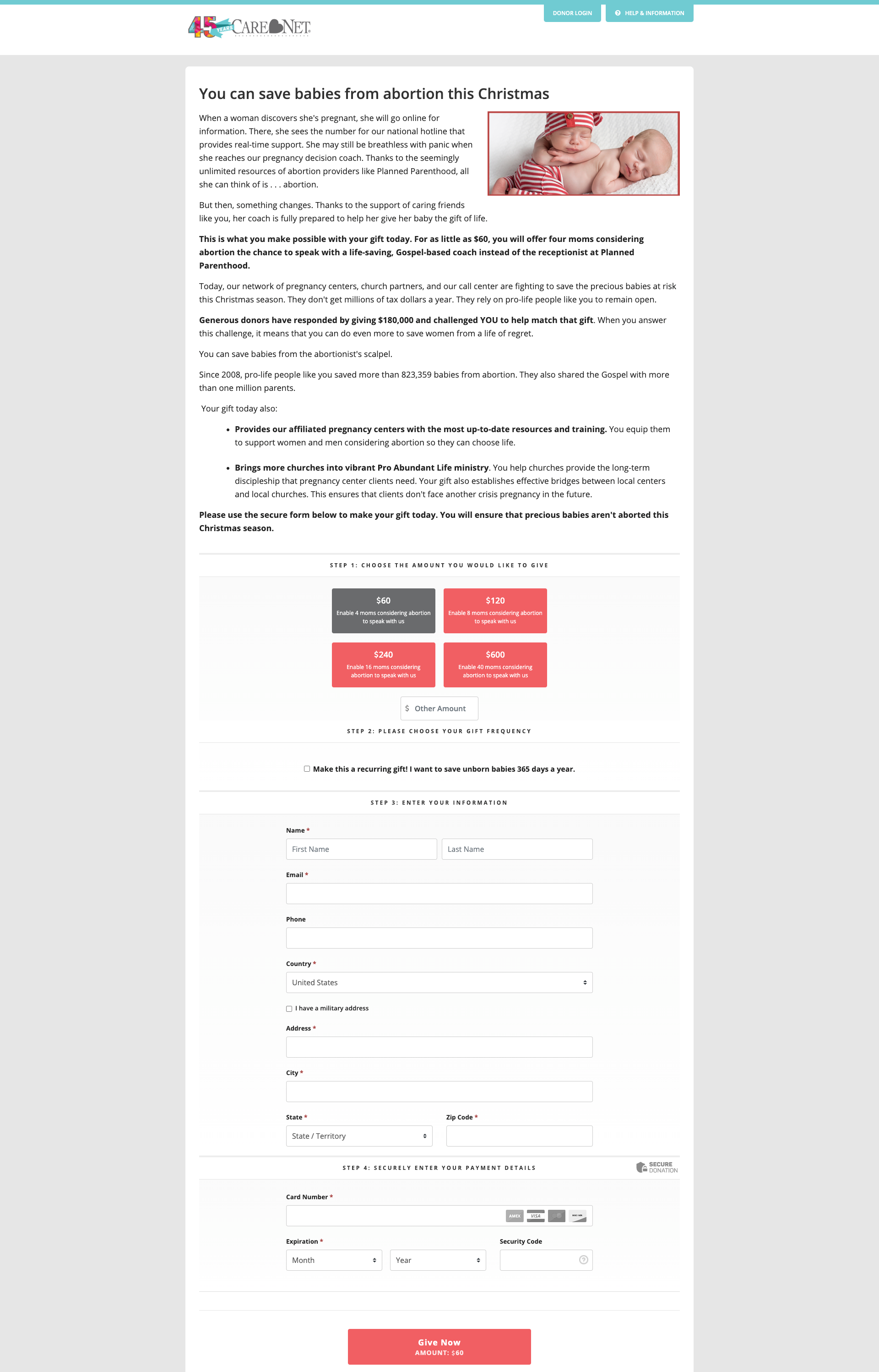 Care Net uses a traditional approach to their gift array buttons. This traditional approach simply has the gift amount on them. In an effort to increase donor conversion and, ultimately, overall revenue, we hypothesized that adding the impact of each specific gift amount might help motivate more people to give.
