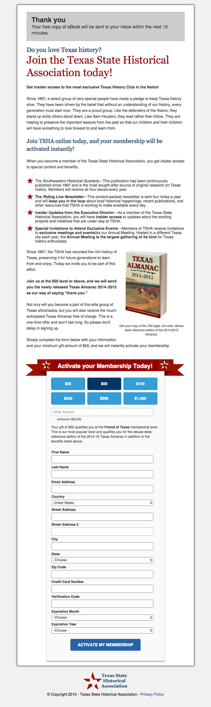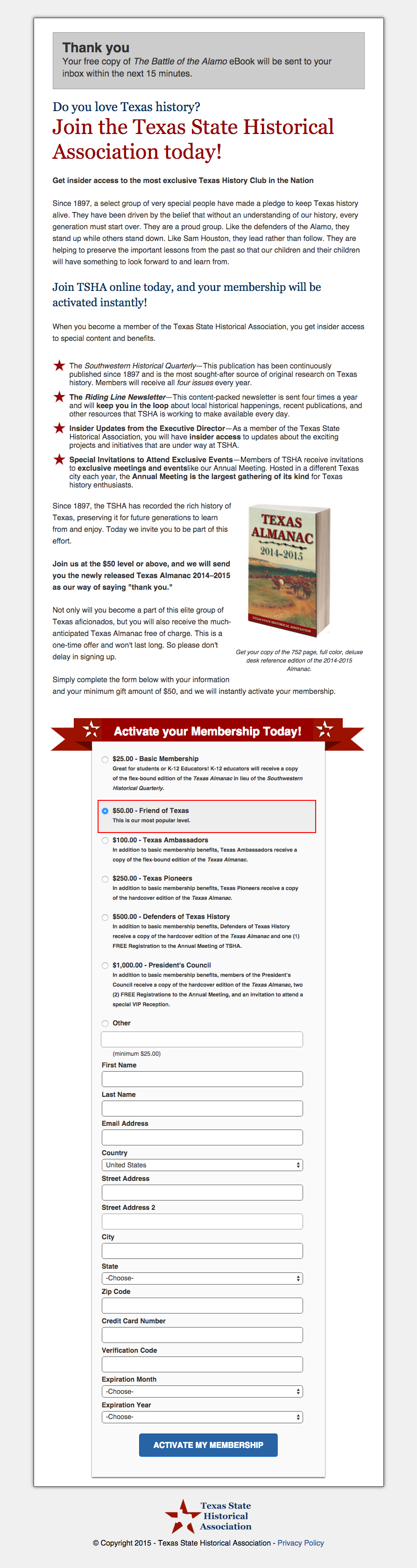 The Texas State Historical Association is a membership-based organization with varying levels of benefits at each member level. The idea is to incentivize members to increase their giving in order to raise the average gift.