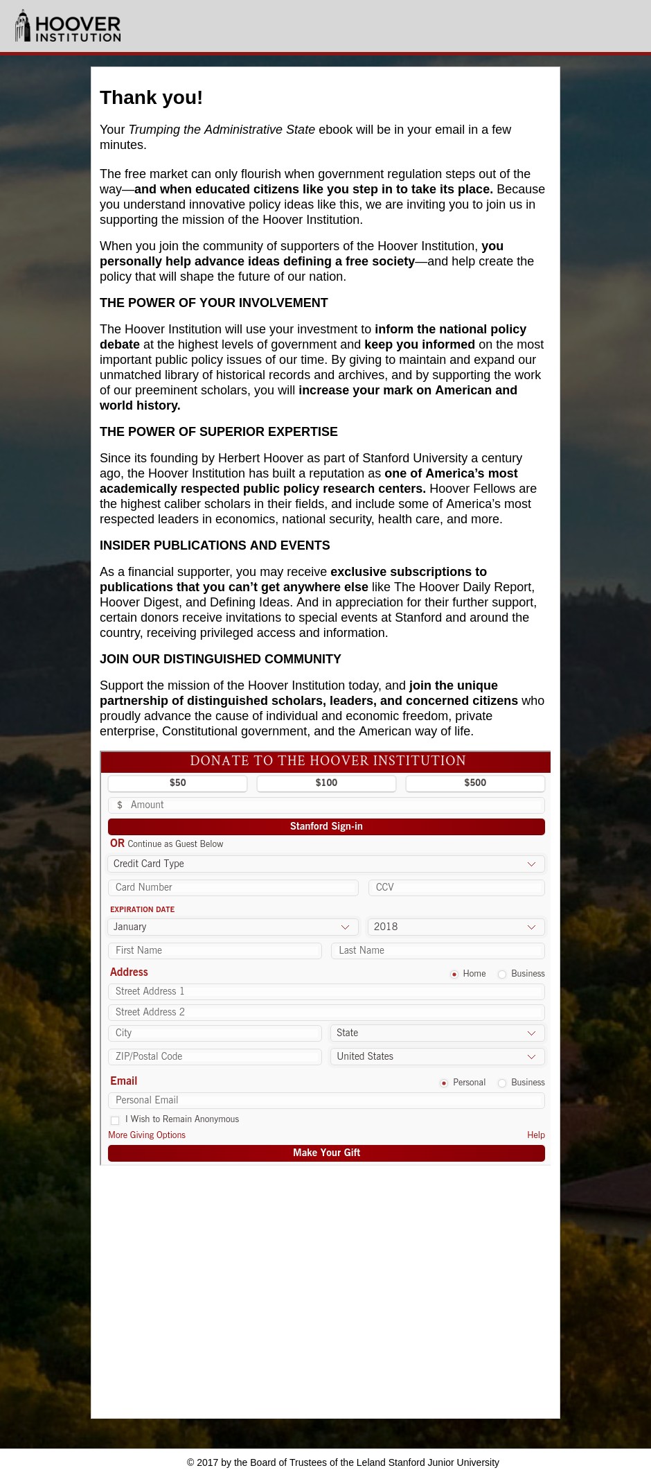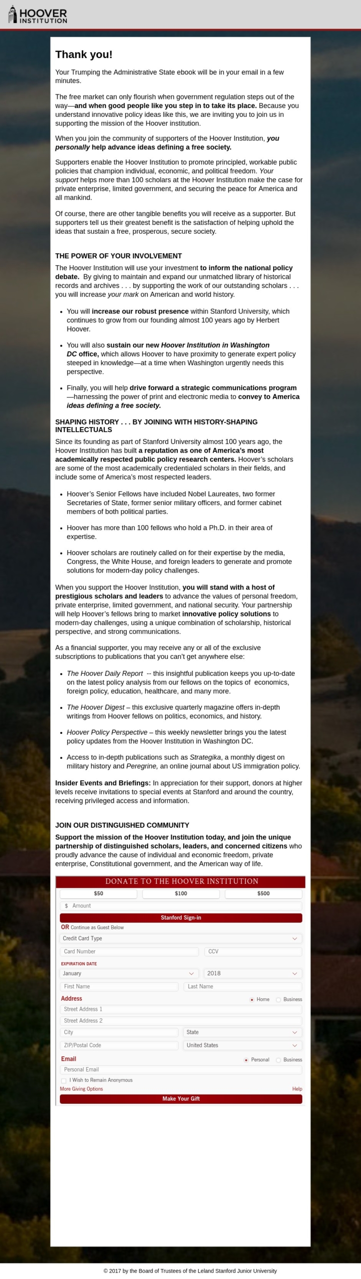 We started out with a very long donation page for the Hoover Institution on their eBook offers, as we have noticed that long form copy on donation pages has typically performed better than short form donation pages in previous experiments on other campaigns. However, since eBook offer Facebook ads and emails are much more short and to-the-point than the typical acquisition or prospecting email, we wanted to see if tightening the value proposition and shortening the page would provide an increase in the number of donations.