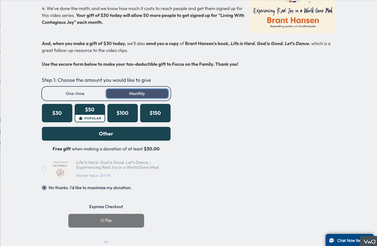 Focus on the Family is a nonprofit organization dedicated to providing guidance and resources to support families. To increase recurring donations, we tested defaulting to a recurring gift option on the donation page for the high-traffic “Living with Contagious Joy” acquisition funnel, an ideal setting to measure the impact of this default on donor conversion.